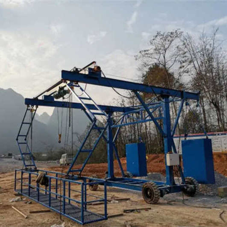 由可轉(zhuǎn)向行走車體(前橋轉(zhuǎn)向系統(tǒng)、后橋驅(qū)動(dòng)系統(tǒng)、行走底盤等)、支架、穩(wěn)定架、橫梁、定距桿、行車梁、滑動(dòng)架、滑輪支架、鋼絲吊繩、鋼絲電動(dòng)葫蘆、手拉葫蘆、電氣控制箱及遙控器、配重吊塊等組成。