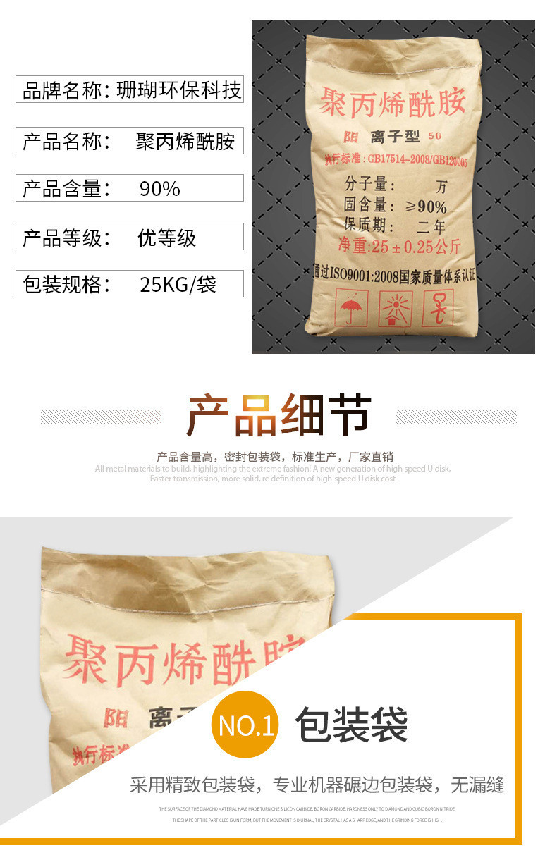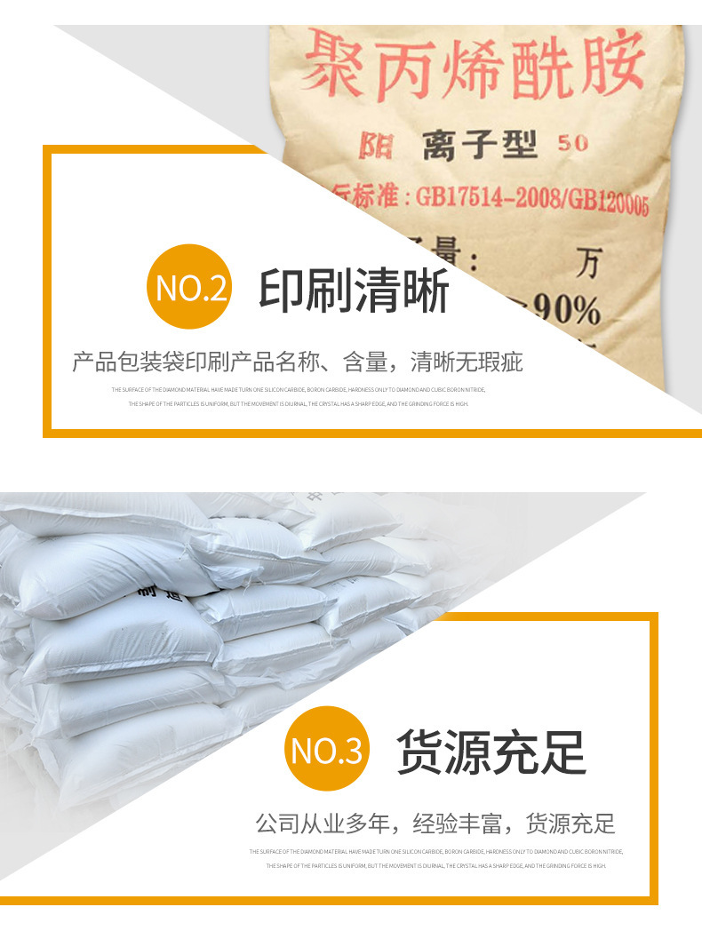該產(chǎn)品廣泛用于化學(xué)工業(yè)廢水、廢液的處理,市政污水處理。自來(lái)水工業(yè)、高濁度水的凈化、沉清、洗煤、選礦、冶金、鋼鐵工業(yè)、鋅、鋁加工業(yè)、電子工業(yè)等水處理。用于石油工業(yè)、采油、鉆井泥漿、廢泥漿處理、防止水竄、降低摩阻、提高采收率、三次采油得到廣泛運(yùn)用。用于紡織上漿劑、漿液性能穩(wěn)定、落漿少、織物斷頭率低、布面光潔。用于造紙工業(yè)、一是提高填料、顏料等存留率。以降低原材料的流失和對(duì)環(huán)境的污染;二是提高紙張的強(qiáng)度(包括干強(qiáng)度和濕強(qiáng)度),另外,使用PAM還可以提高紙抗撕性和多孔性,以改進(jìn)視覺(jué)和印刷性能,還用于食品及茶葉包裝紙中。食品行業(yè),用于甘蔗糖、甜菜糖生產(chǎn)中蔗汁澄清及糖漿磷浮法提取。酶制劑發(fā)酵液絮凝澄清工業(yè) ,還用于飼料蛋白的回收、質(zhì)量穩(wěn)定、性能好,回收的蛋白粉對(duì)雞的成活率提高和增重、產(chǎn)蛋無(wú)不良影響,合成樹(shù)脂涂料,土建灌漿材料堵水,建材工業(yè)、提高水泥質(zhì)量、建筑業(yè)膠粘劑,填縫修復(fù)及堵水劑,土壤改良、電鍍工業(yè)、印染工業(yè)等。