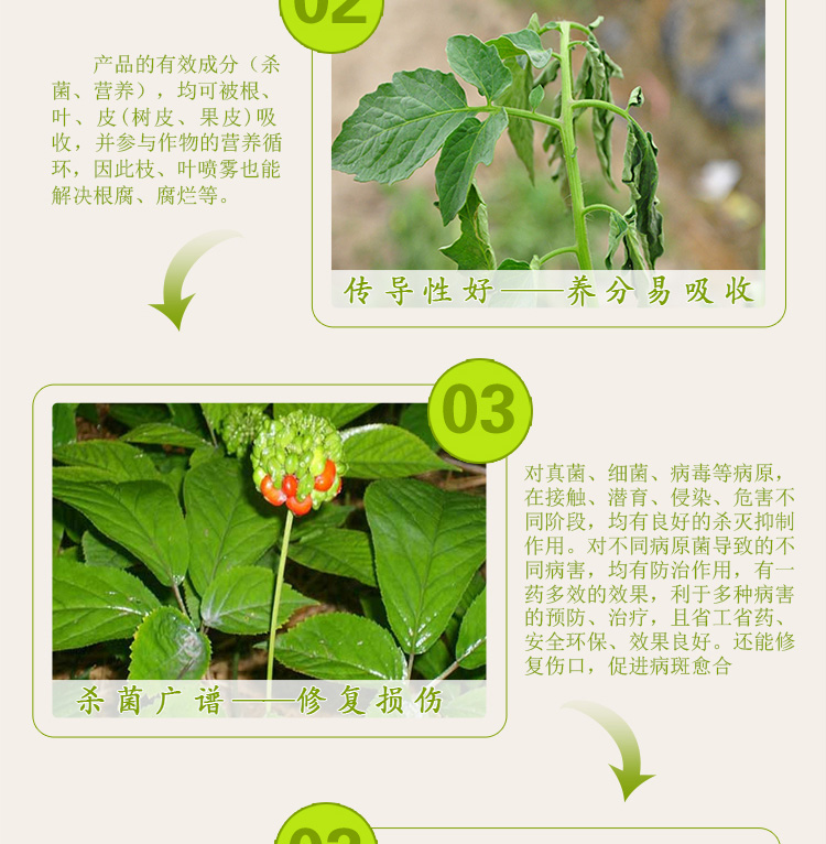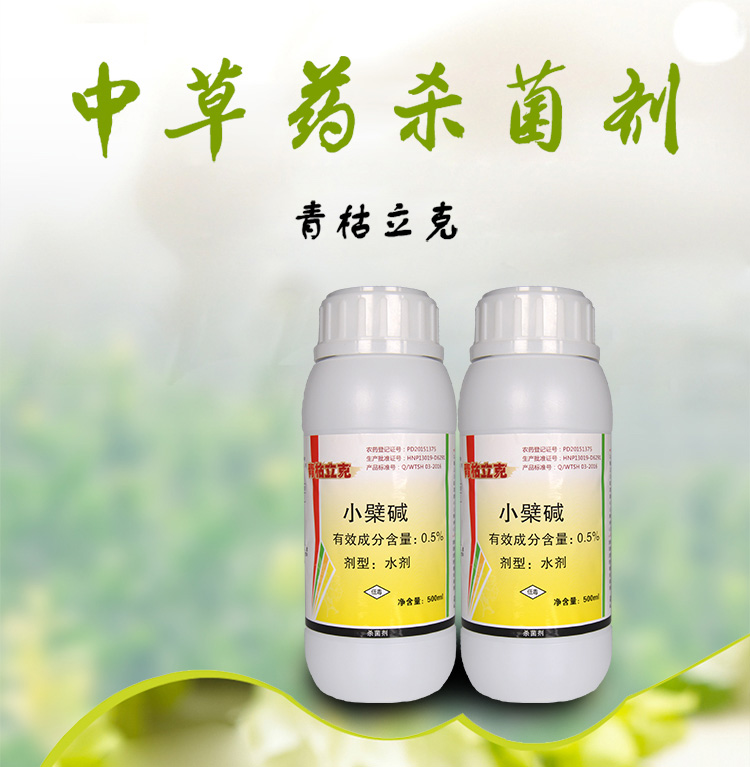 《青枯立克》:中藥制劑,真細(xì)菌通殺,雙向傳導(dǎo)能力強(qiáng),具有殺菌、、促進(jìn)生根等功效。內(nèi)含殺菌成分(綠原酸、生物堿等)及營養(yǎng)復(fù)壯成分(氨基酸、多糖等),能殺菌、,調(diào)理內(nèi)循環(huán),,增強(qiáng)抗病能力,修復(fù)傷口,減少病菌侵入途徑等作用,同時具有補(bǔ)充營養(yǎng)、輔助生根、提苗快、長勢好等作用,連續(xù)使用無抗藥性,任何時期使用50倍液以上對作物安全。