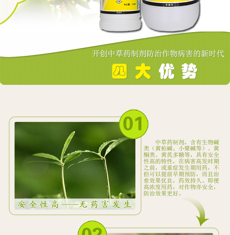 3)安全、環(huán)保方面:無抗藥性、無殘留,能連續(xù)使用;純中藥成分,不影響綠色有機(jī)標(biāo)準(zhǔn)。