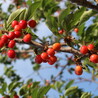 櫻桃苗修剪:a.修剪應注意事宜櫻桃的枝分為發(fā)育枝和結(jié)果枝兩類,幼樹上發(fā)育枝較多,其前端葉芽延伸生長,擴大樹冠,下部腋芽抽生結(jié)果枝。進入結(jié)果期后,大部分一年生枝頂芽為葉芽外,腋芽多為花芽,稱為結(jié)果枝。結(jié)果枝依長度分為長果枝(15~20厘米)、中果枝(5~15厘米)、短果枝(5厘米左右)、花簇狀果枝(1~2厘米)。從結(jié)果能力看,長果枝座果力較差,一般在40%左右;中果枝結(jié)果能力因品種而不同;短果枝座果率高,果實品質(zhì)亦佳;花簇狀果枝是盛果期旺樹上的主要結(jié)果枝,座果率能達80%左右。果實品質(zhì)較佳,而且壽命長,可連續(xù)結(jié)果10~20年。結(jié)果枝和花簇狀果枝是產(chǎn)量形成的基礎(chǔ)。櫻桃、酸櫻桃在初果期,長、中果枝的比例大,而在盛果期則短果枝和花簇狀果枝為主。b.幼樹的修剪為了幼樹早結(jié)果,在的基礎(chǔ)上,對各類枝條的修剪程度要輕,以生長期的摘心為主。以控制枝梢旺長,分枝,加迅擴大樹冠。冬季修剪時間應推遲到萌芽前,以避免剪口失水干枯。除對主枝、枝短截和適當間疏一些過密、交叉枝外,其余中、小枝要盡量保留。c.結(jié)果樹的修剪常在采果后進行夏季修剪。采用疏剪去除過密過強、擾亂樹冠的多年生大枝,進行樹冠結(jié)構(gòu),促進花芽形成。在疏除大枝時,注意傷口要小,要平,以利盡快愈和。疏除一年生枝時,可先在其基部腋花芽以上剪截,待結(jié)果光禿后,再疏除。冬季修剪時,應注意對骨干枝先端和短果枝的2~3年生枝段進行適當回縮,以營養(yǎng)生長和新果枝的不斷形成,防止結(jié)果部位外移和樹冠內(nèi)部光禿。d.衰老樹的修剪主要任務是及時更新復壯、利用生長勢強的徒長枝來形成新的樹冠。對骨干枝先衰弱而無結(jié)果能力的,要及時回縮。利用隱芽回縮更新時,櫻桃的隱芽壽命約5~10年。為了回縮有枝更新,回縮處有生長較正常的小分枝,這對樹體損傷較小?;乜s修剪后發(fā)出的徒長枝,選擇方向、位置、長勢適當、向外開展的枝來新主枝、側(cè)枝。過多的應疏除,余者短截,促發(fā)分枝,然后緩放,使其形成結(jié)果枝組。大枝更新時,亦應在采果后進行,以免引起傷口流膠。