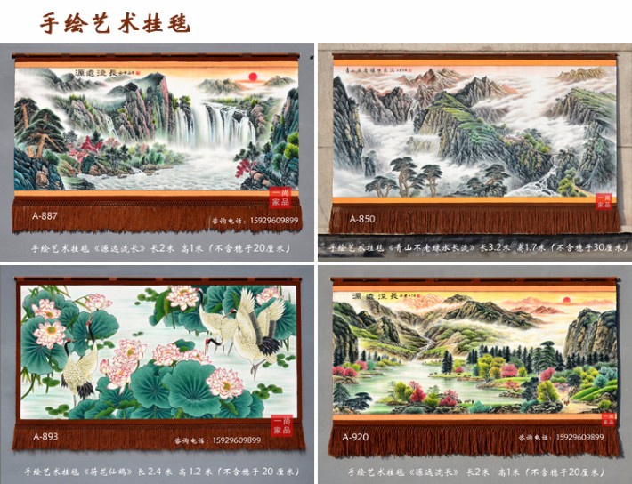 毯子上純手工繪制出國(guó)畫山水畫、工筆畫的一種藝術(shù)掛毯。因掛毯色
